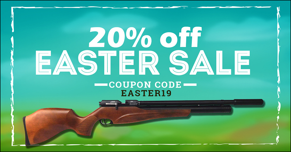 Happy Easter! We would like to help you celebrate with 20% off many items in stock through Easter Weekend 2019. This sale ends at midnight Sunday April 21st. just use coupon code EASTER19 during checkout at BakerAirguns.com.