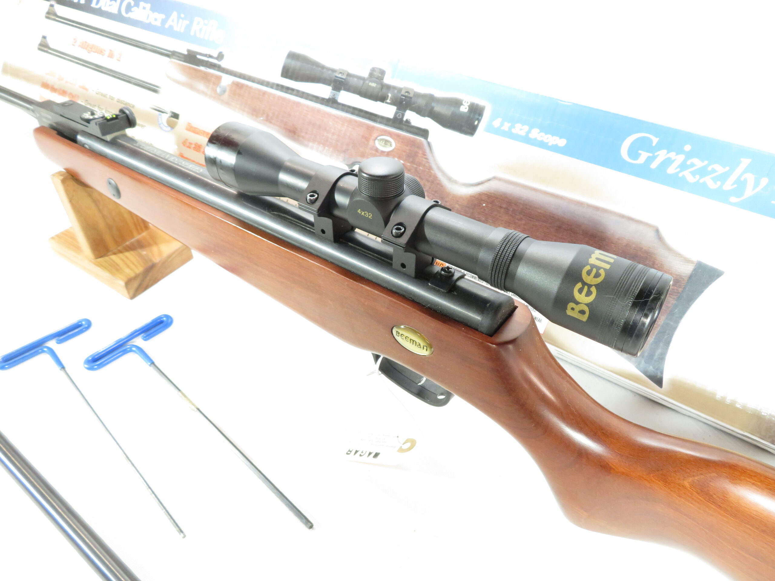 The Beeman Grizzly is a dual caliber, spring piston break barrel air rifle with a wood stock and 11mm dovetail scope rails. This one comes with a 4×32 scope.