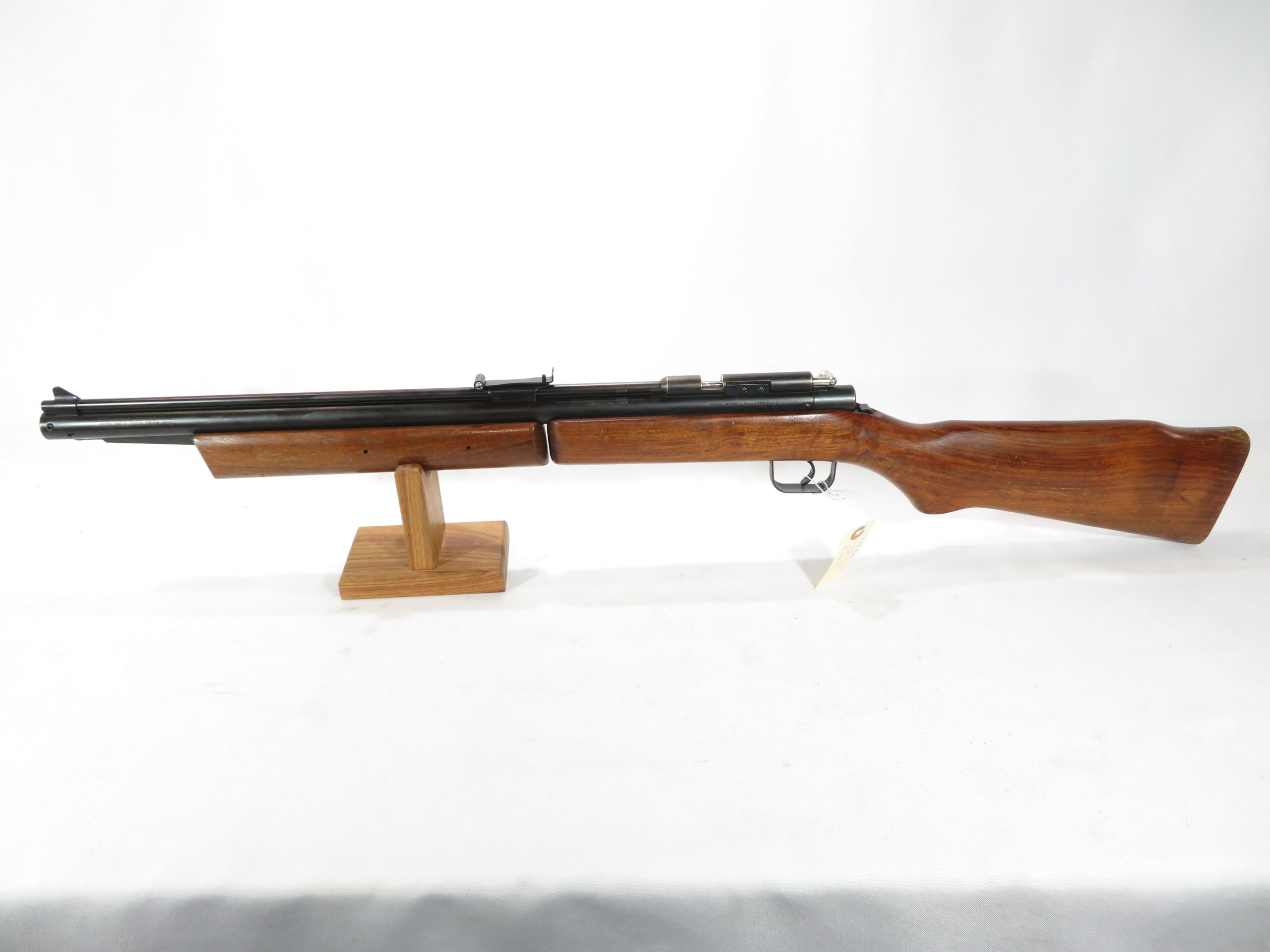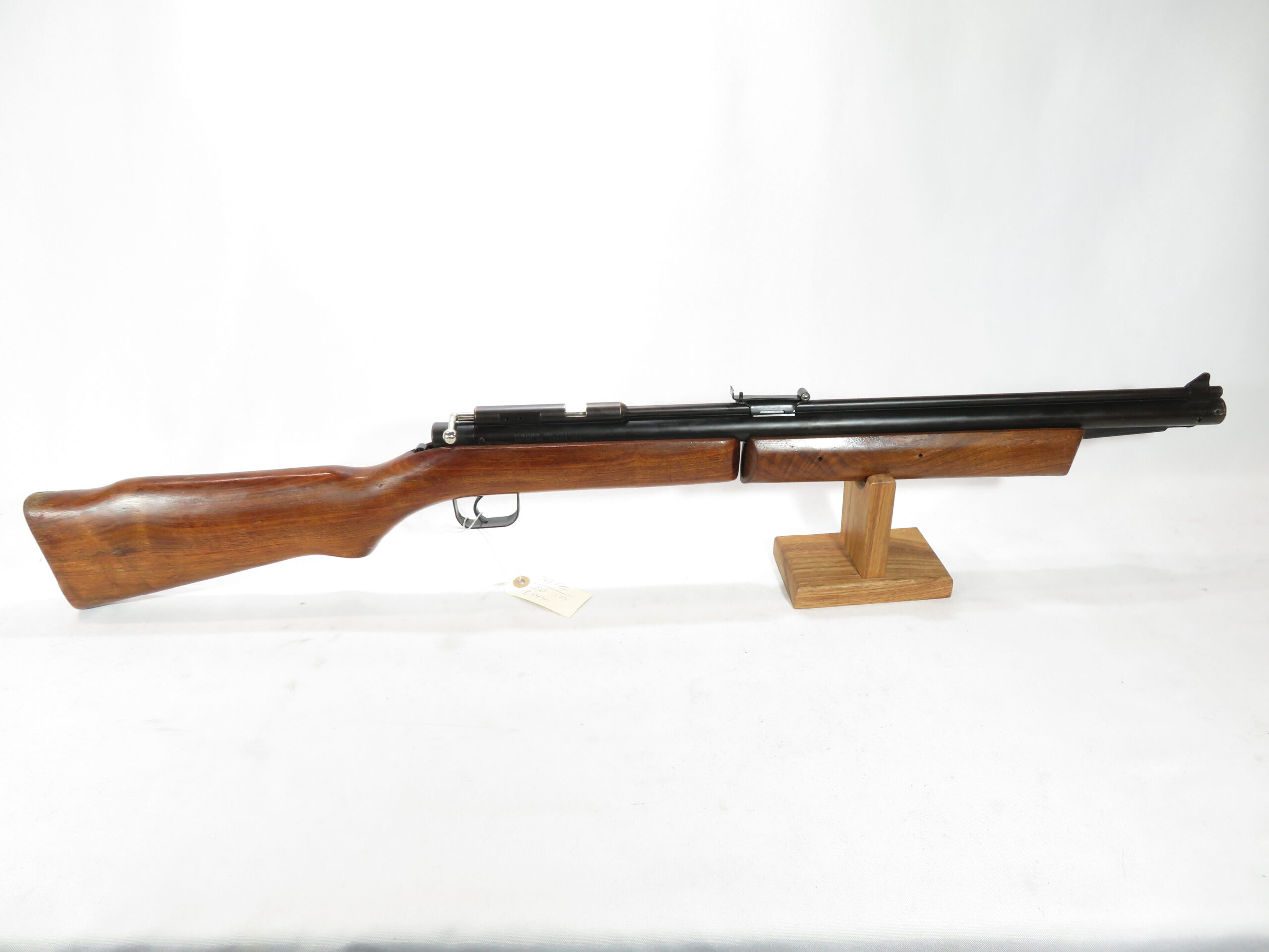 The wood stock and pump handle retain 80% of the original finish, and metal finish is in good condition.