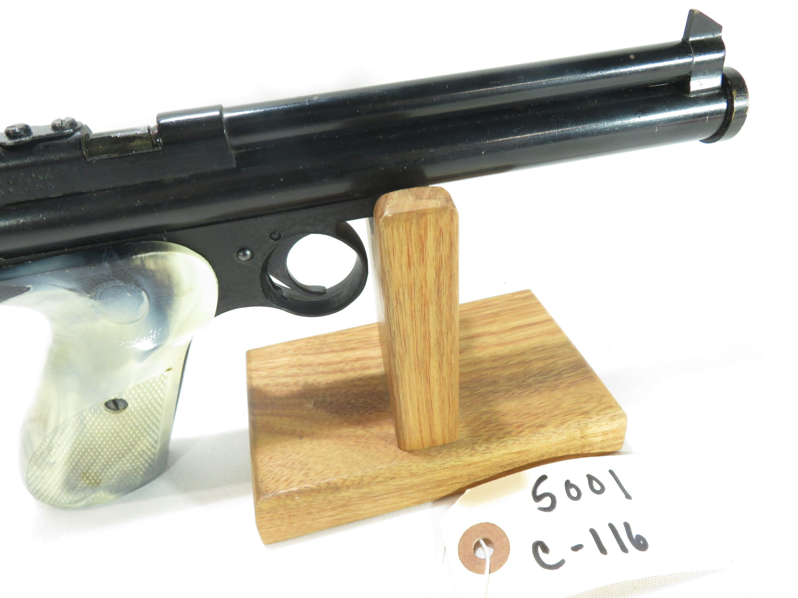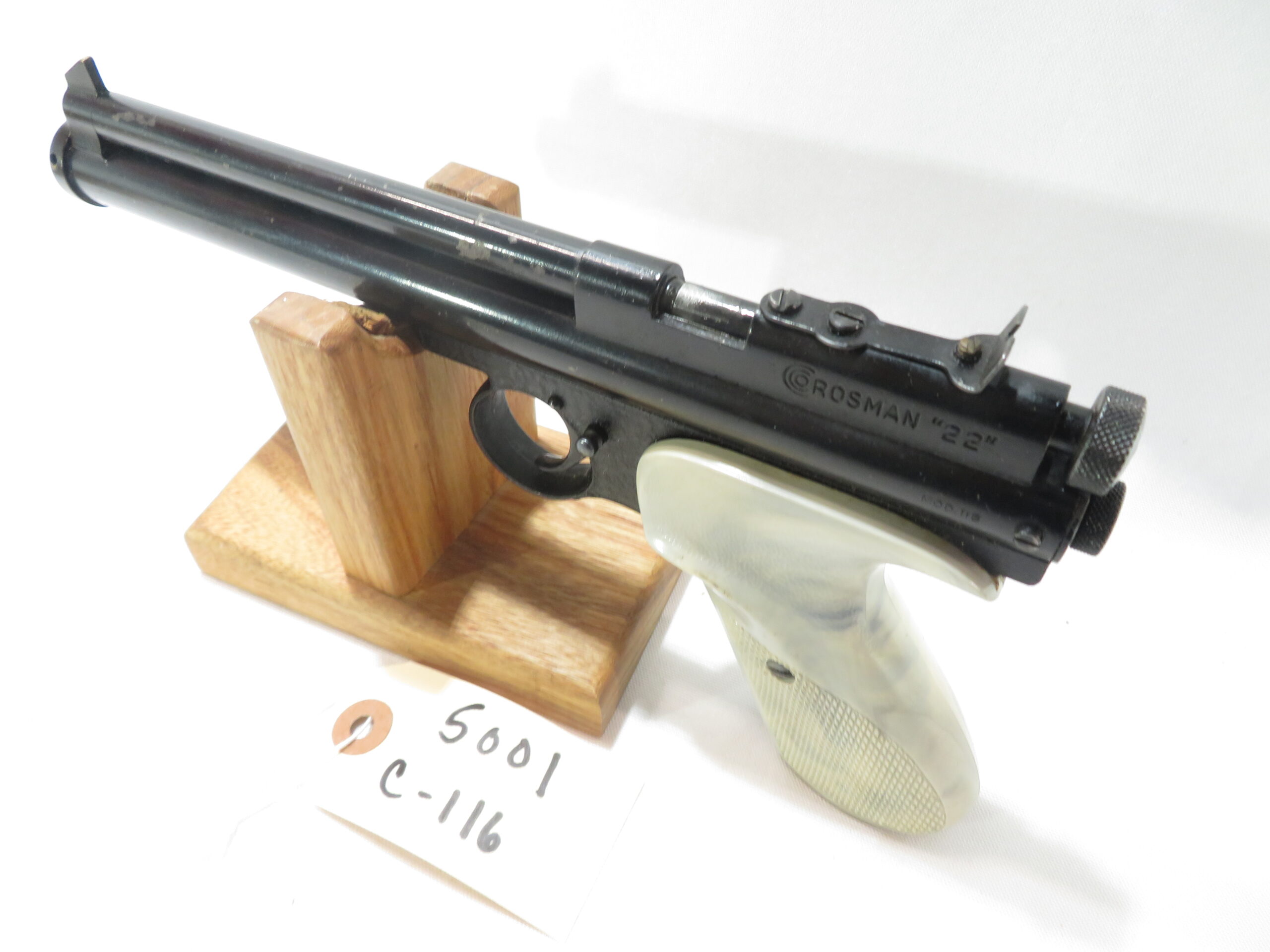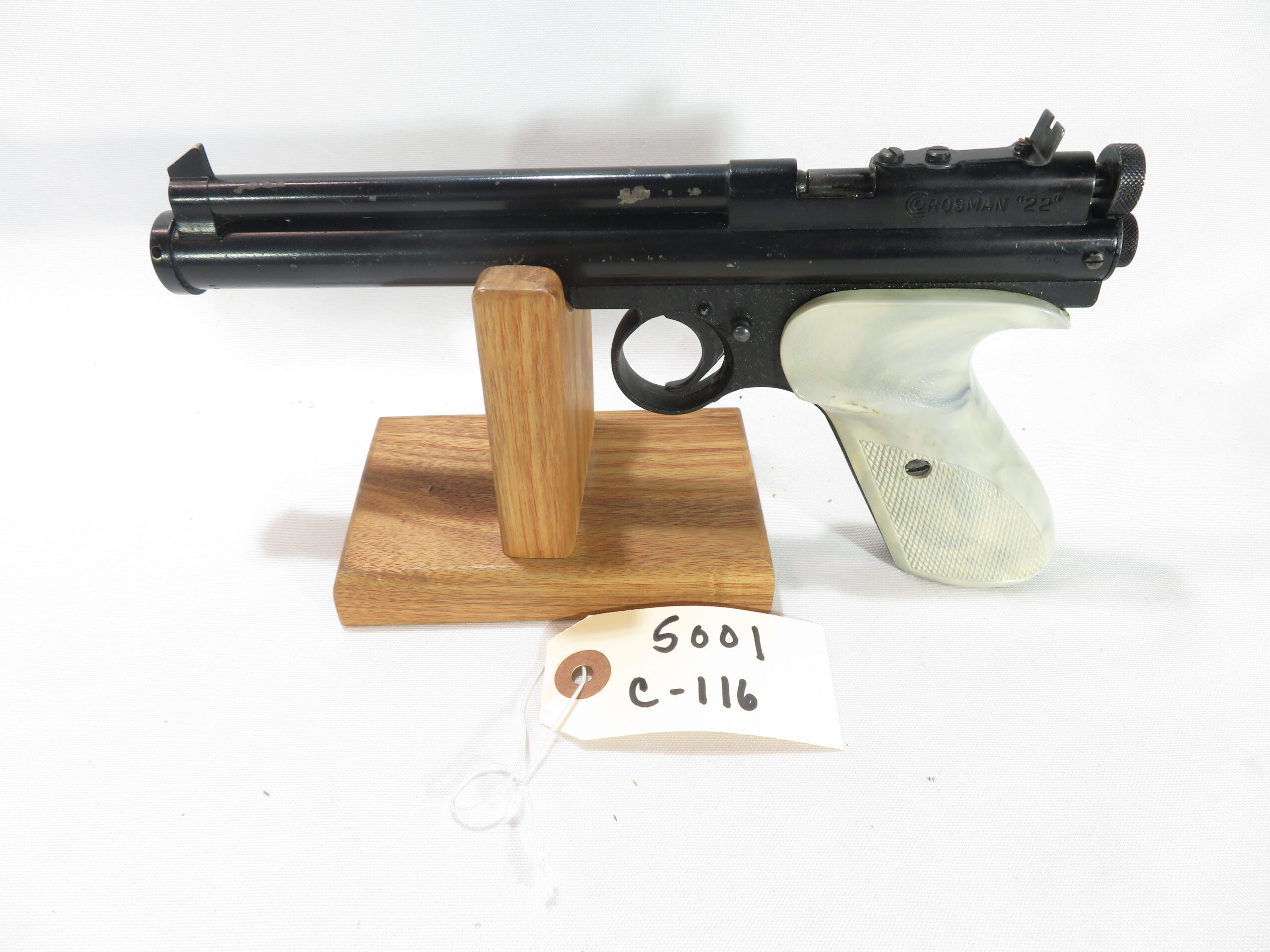 The Crosman 116 is a pre-charged CO2, .22 single shot, bolt action pellet pistol with a plastic grip. They were manufactured between 1951 and 1954. You can add a bulk fill adapter to your order which makes it possible to fill with a paintball tank though. https://www.bakerairguns.com/product/multi-tip-adapter/