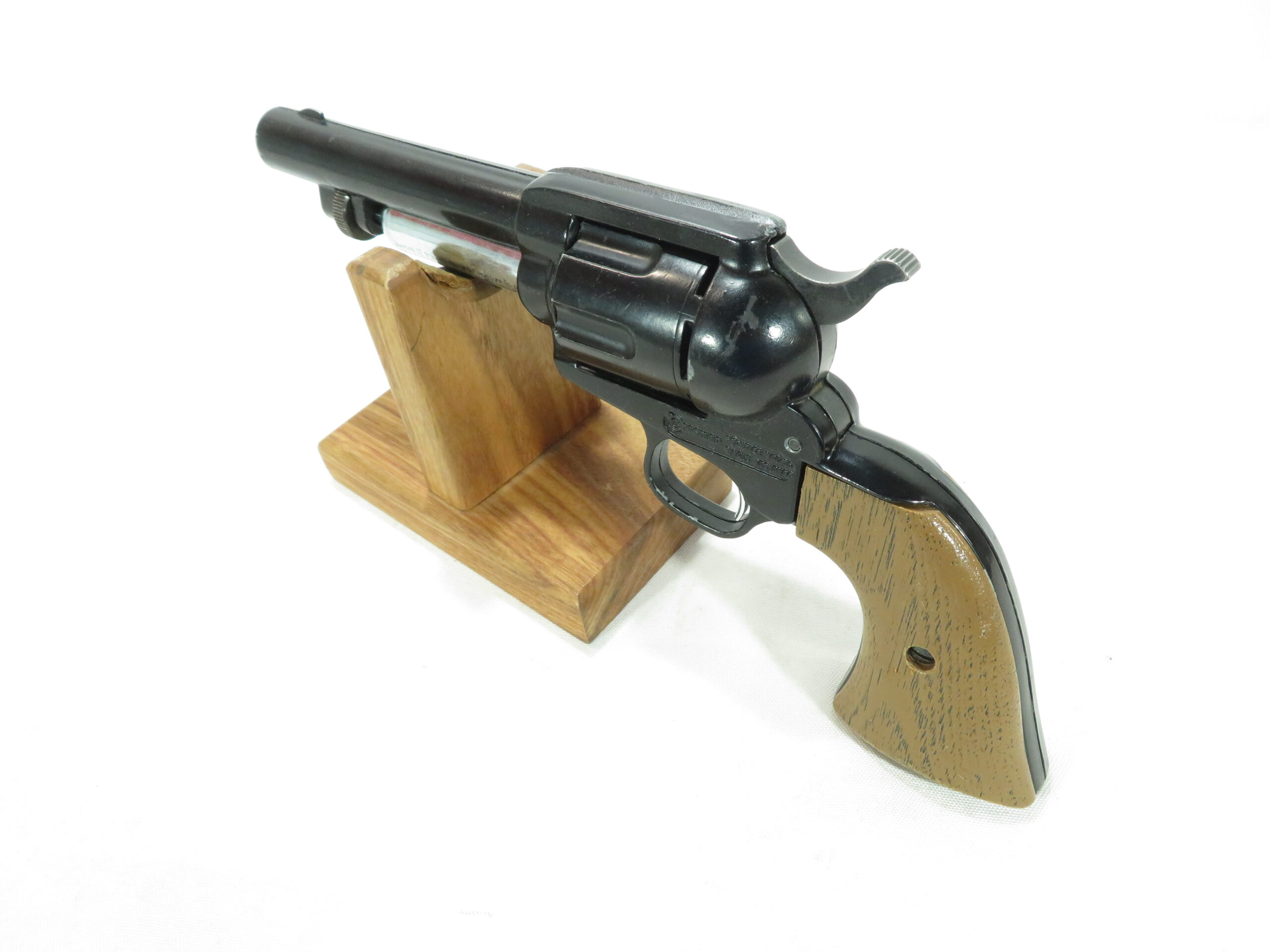 The Crosman 36 Frontier is a BB caliber CO2 single-powerlet pistol. This gun is single action full-size, full weight replica of the Colt single action revolver. This gun has a six-shot revolving clip, and a twelve-shot spring-fed tubular magazine. This gun is basically a continuation of the Hahn/Crosman model 45, series one. This Model 36 has 85% of its original blue finish, and its plastic grips are also in good condition.