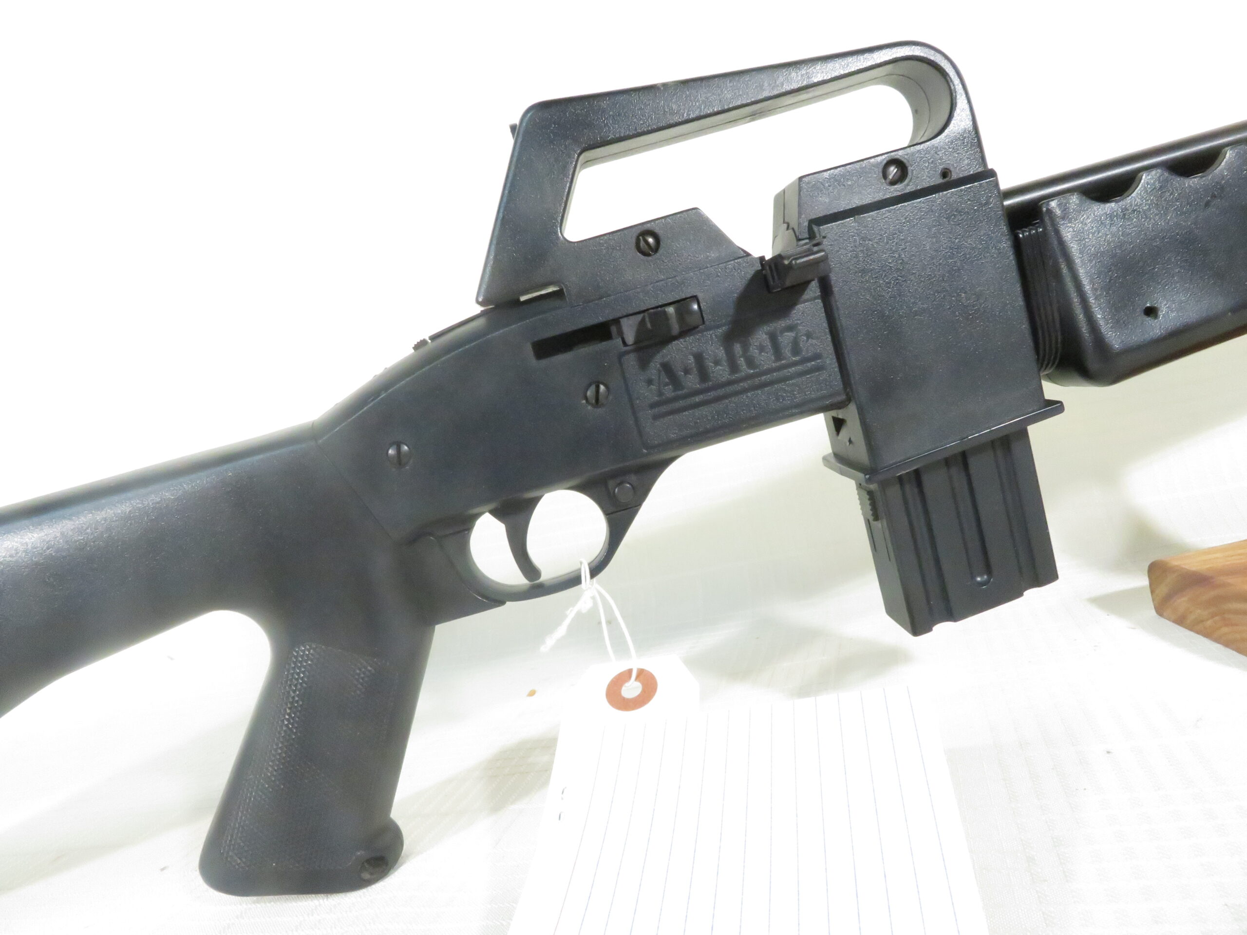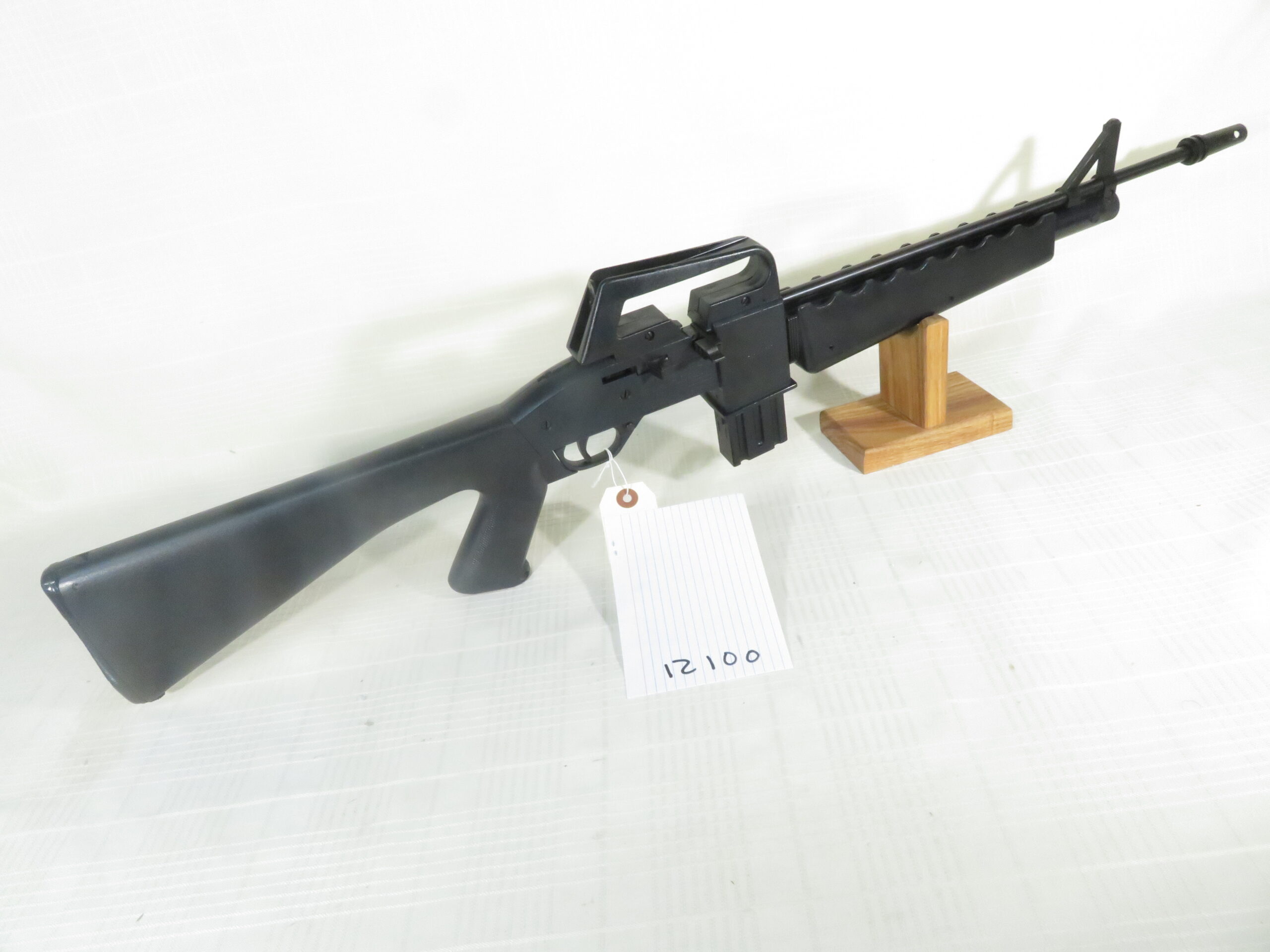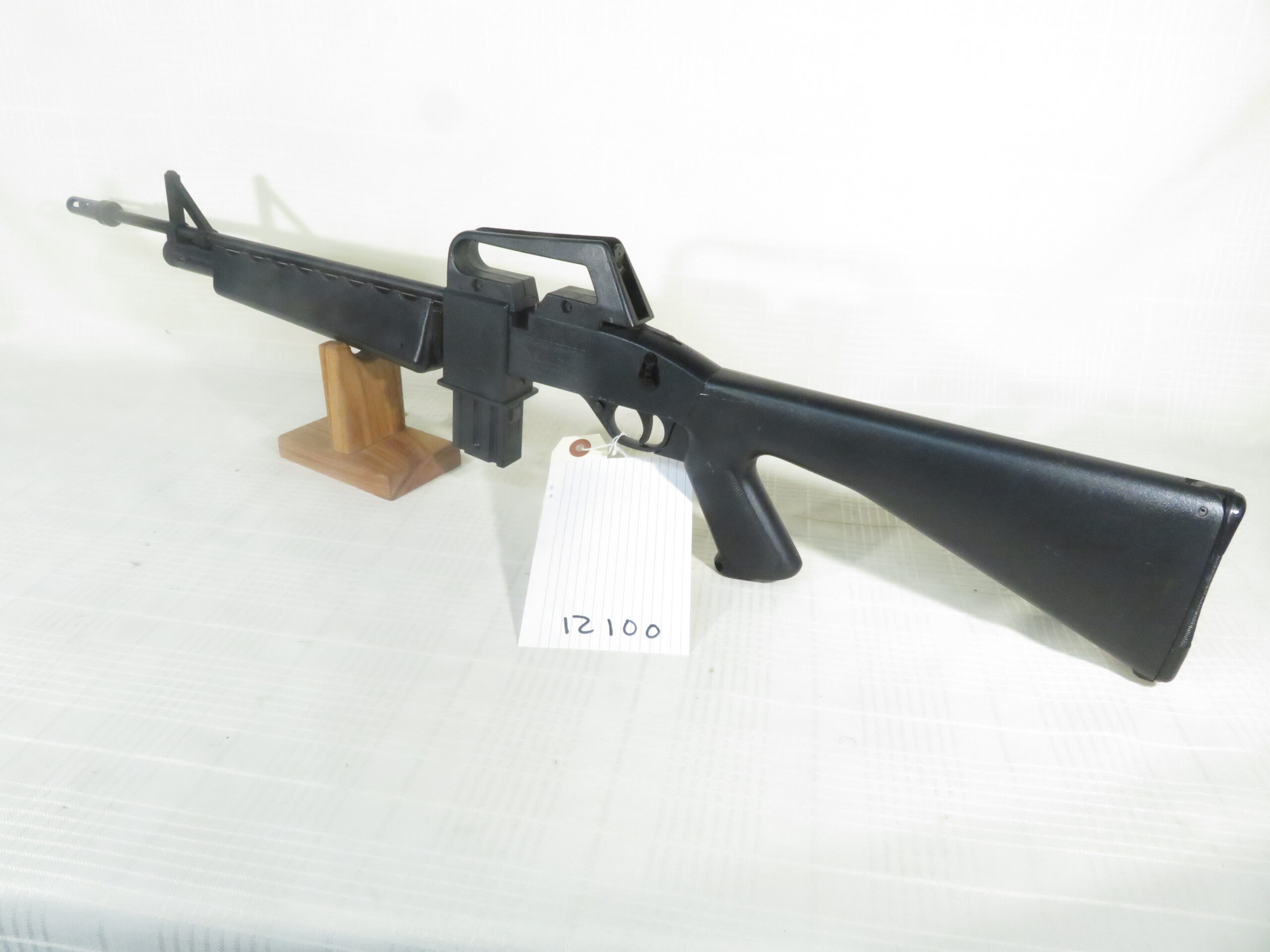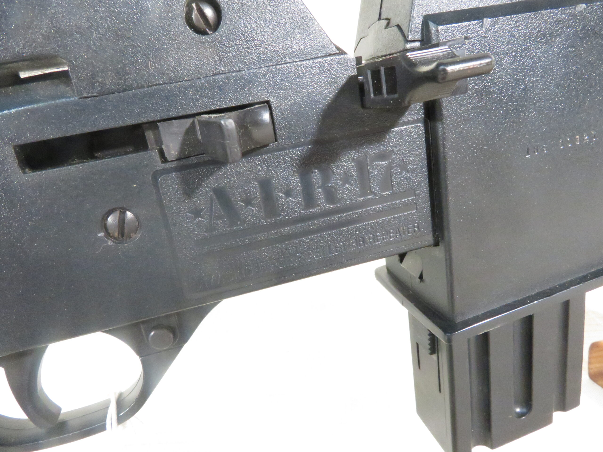 The Crosman AIR 17 is modeled after the Colt AR-15 / M16. It’s a single shot swinging forearm single pump pneumatic repeater with a pistol grip stock, and shoots either .177 caliber pellets, or BBs, and has a 195 round BB reservoir shaped like an ammo clip. They were manufactured between 1985 and 1990.