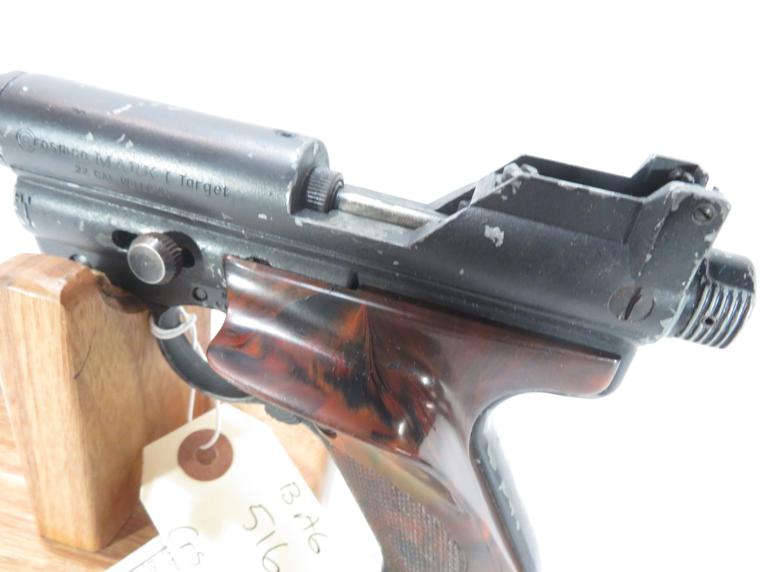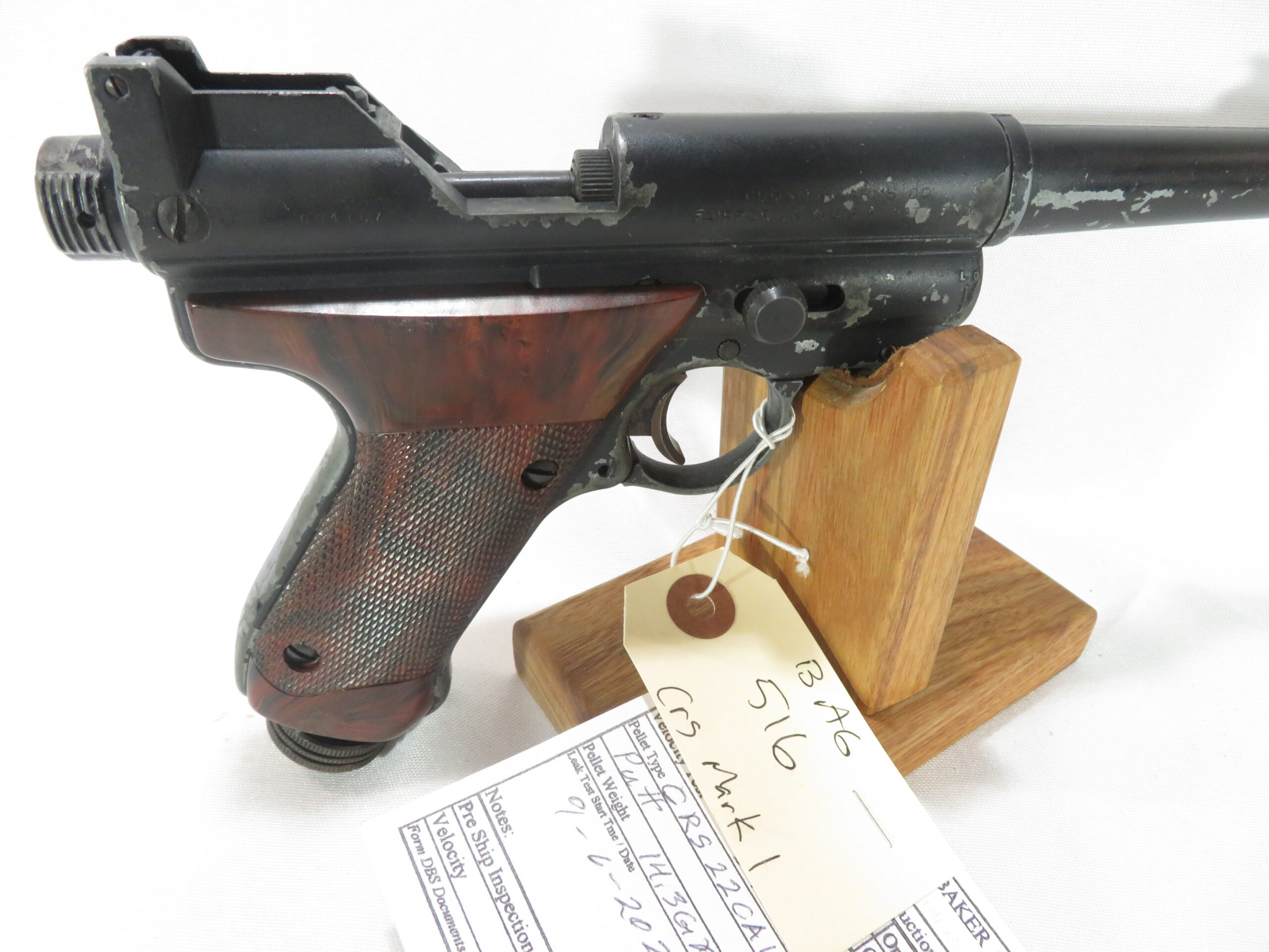 This airgun is styled like the Ruger .22 semi-automatic pistol. The Crosman Mark I pistol is a .22 caliber single shot CO2 air pistol that was made from 1966 to 1983. This was a very popular gun for Crosman for many years. These guns are very heavy, solid and rugged. They continue to be very popular with collectors and shooters because of their excellent accuracy.