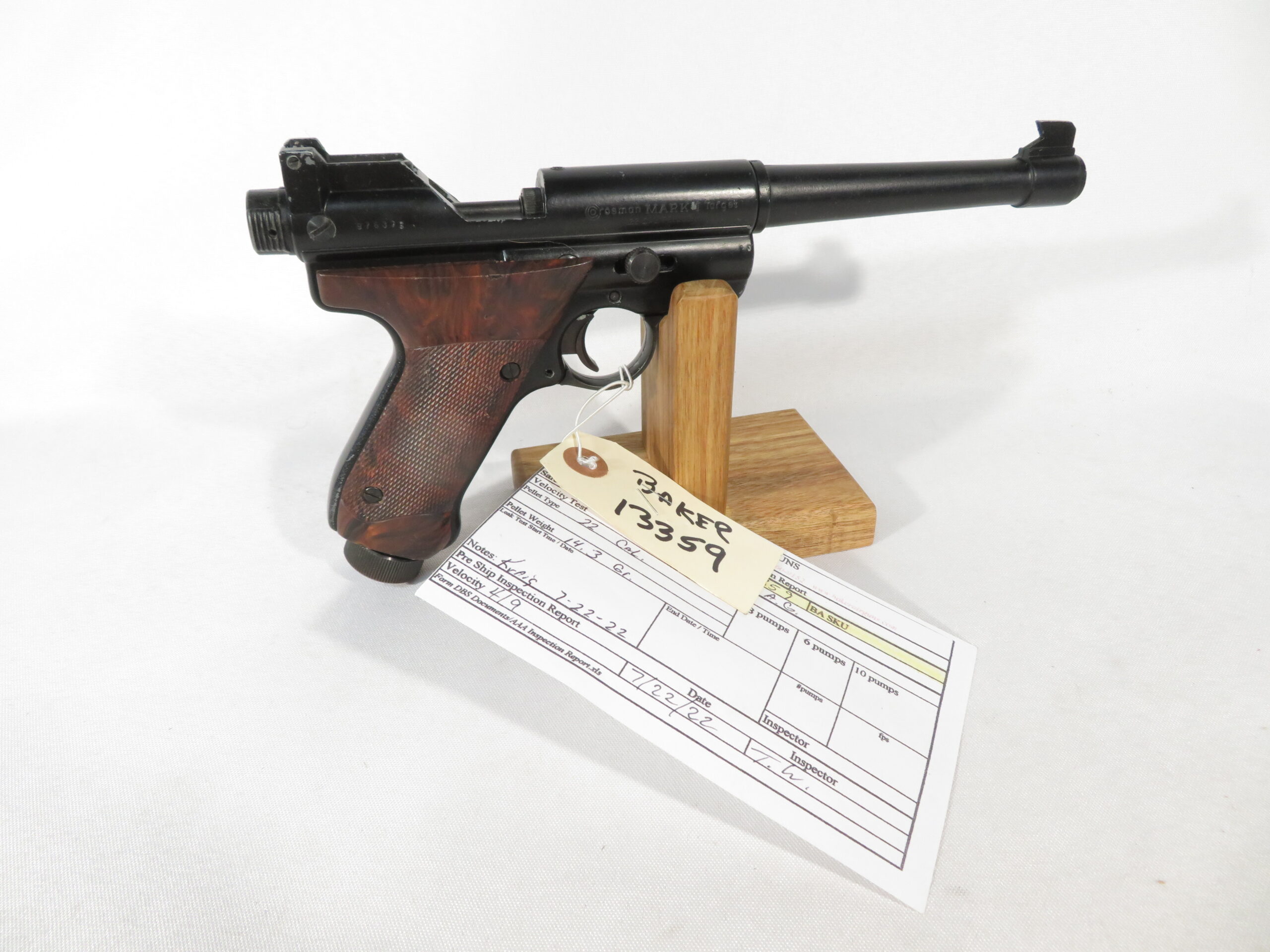 This airgun is styled like the Ruger .22 semi-automatic pistol. The Crosman Mark I pistol is a .22 caliber single shot CO2 air pistol that was made from 1966 to 1983. This was a very popular gun for Crosman for many years. These guns are very heavy, solid and rugged. They continue to be very popular with collectors and shooters because of their excellent accuracy.