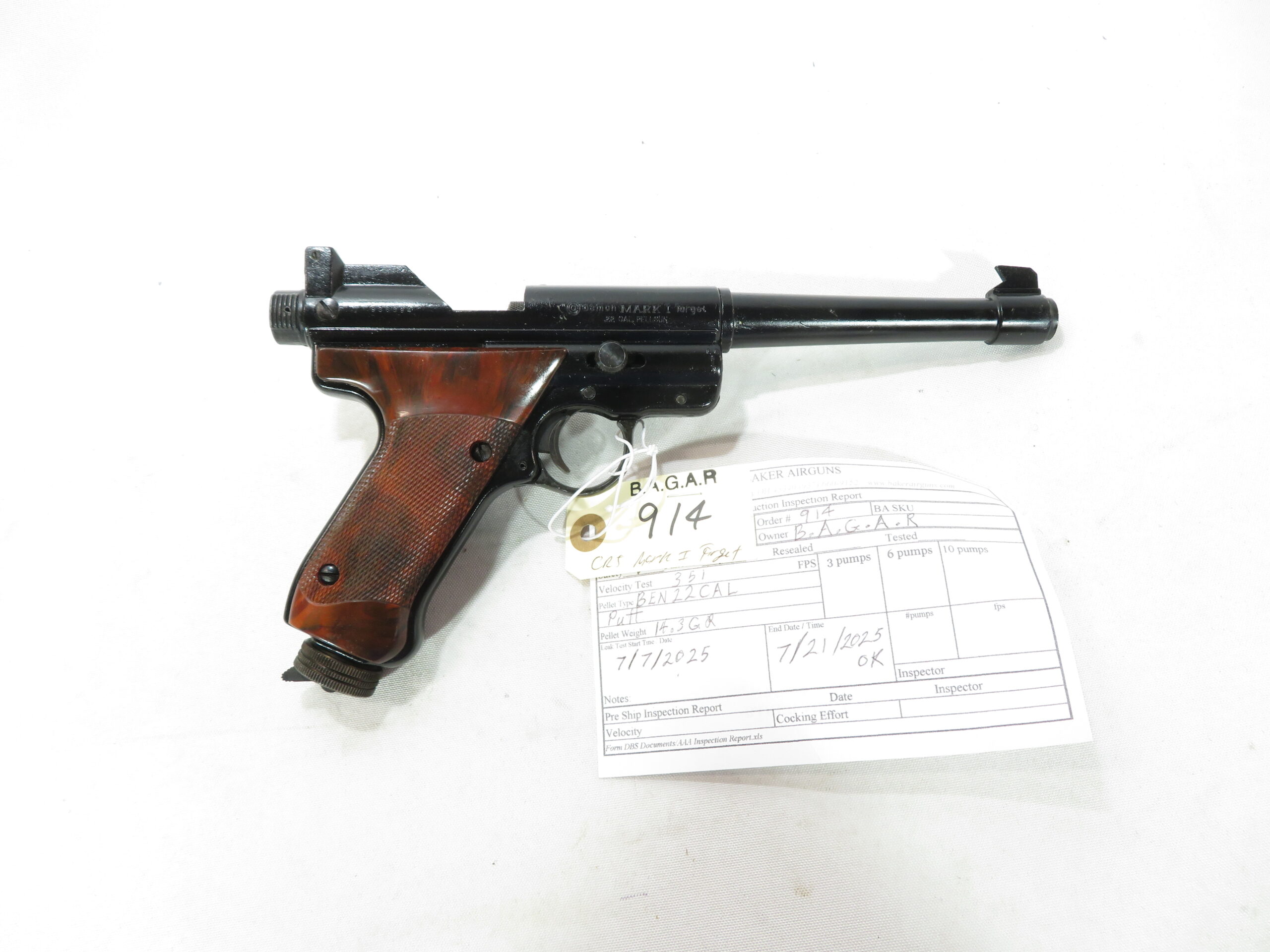 Resealed in our shop. Velocity tested 351 fps with 14.3 grain lead pellets