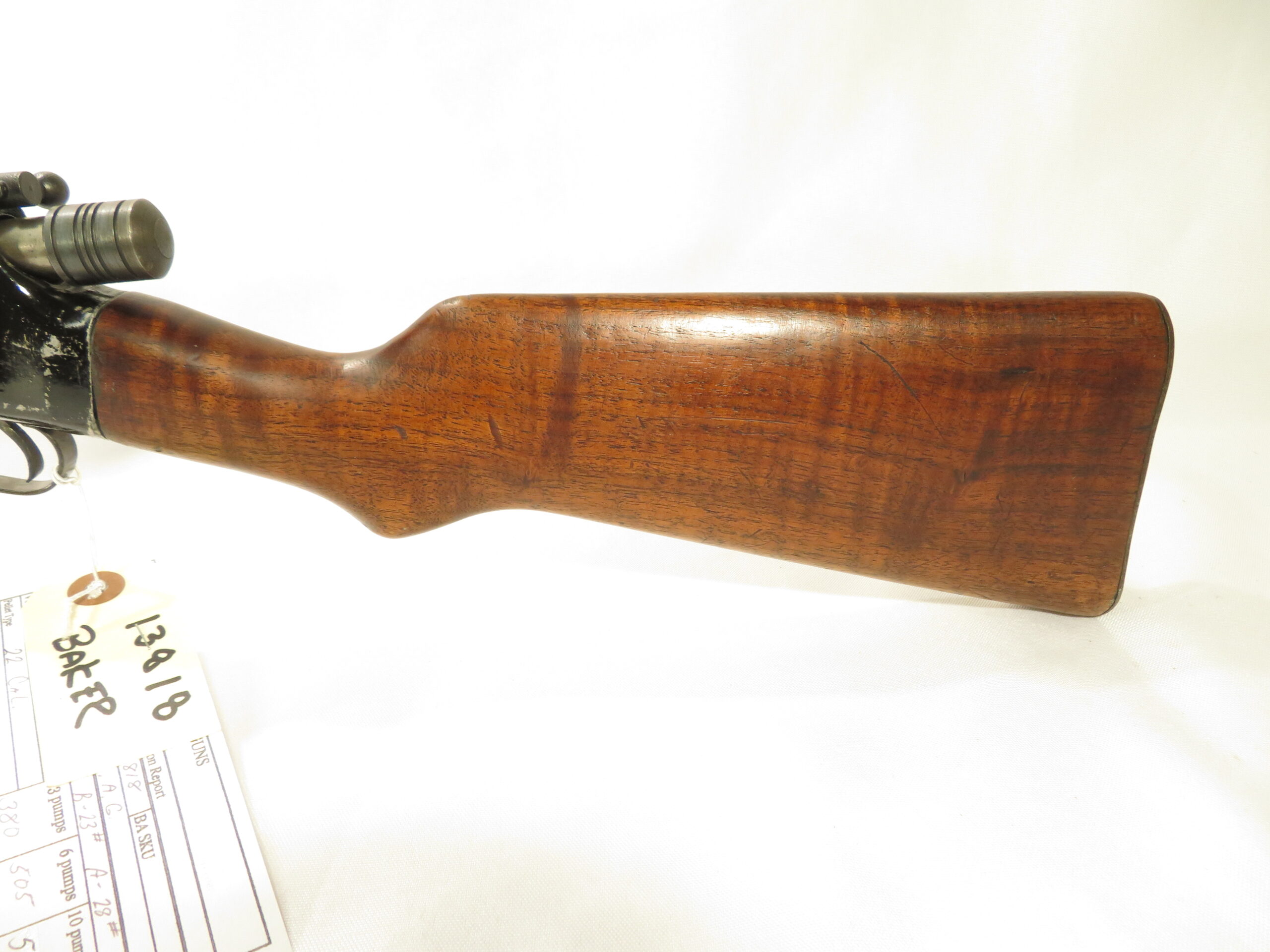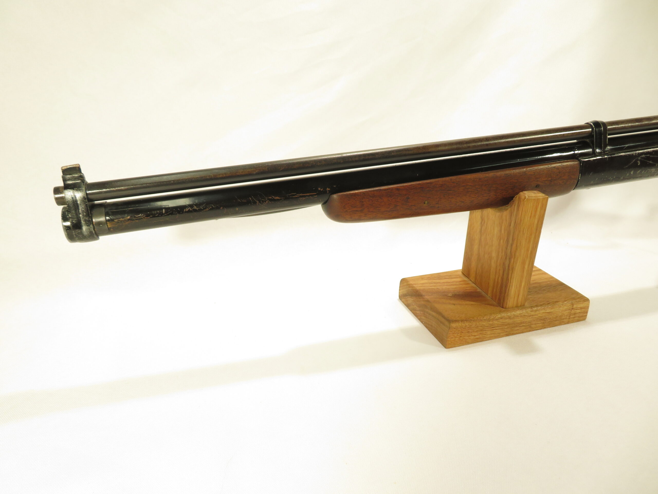 This one has a 5 grooved cocking knob , rifled brass barrel, rear sight, walnut stock and forearm.