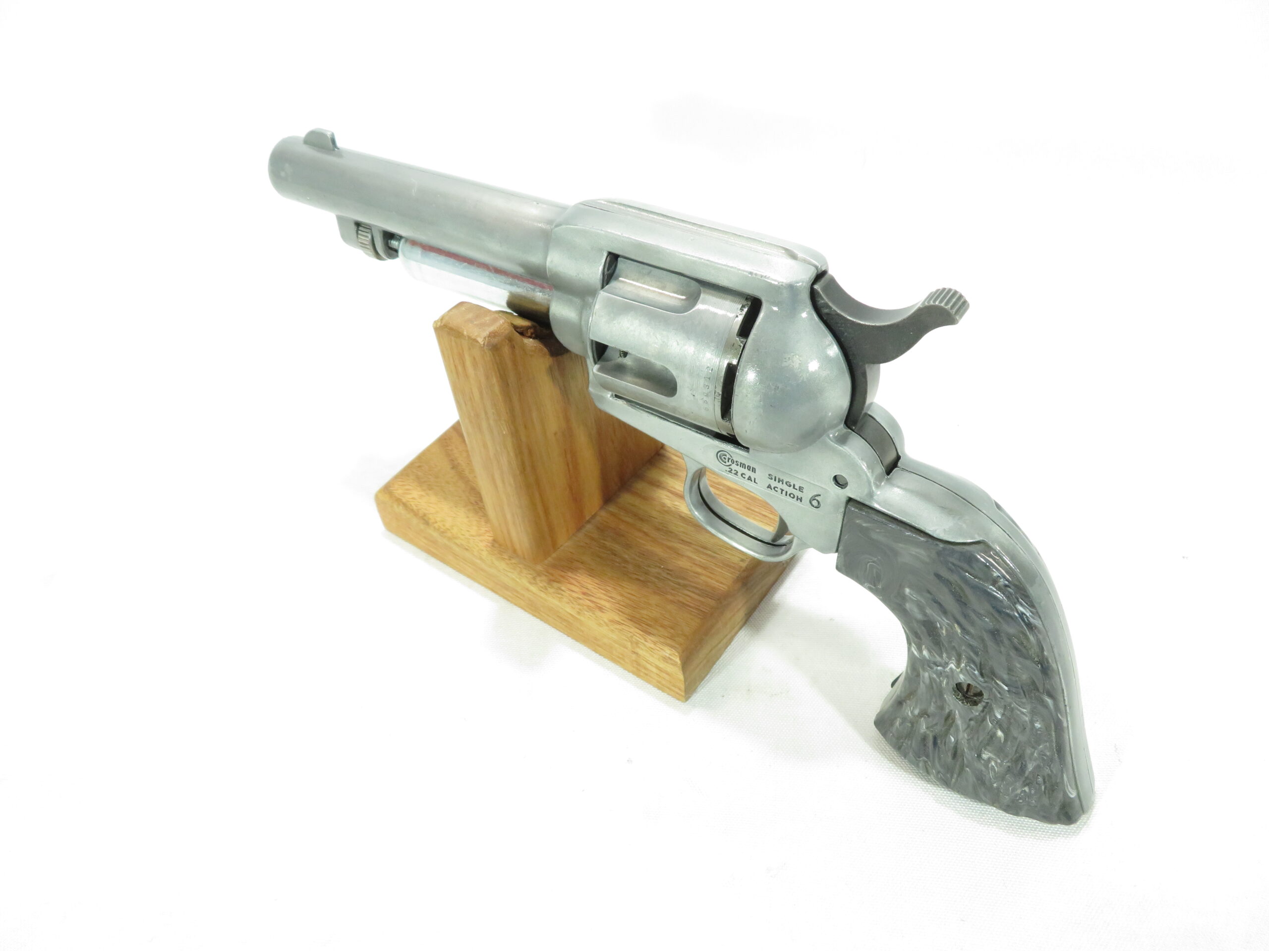 The Crosman SA6 is a single-action CO2 .22 caliber revolver. The SA6 uses one powerlet, and has a six-shot rotary clip. They’re a replica of the Colt Peacemaker SA revolver. This one is a rare silver/gray color.