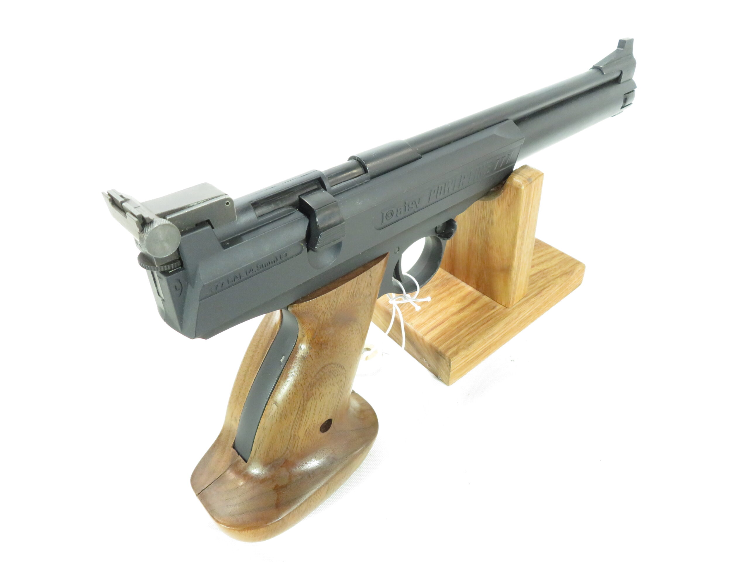 The Daisy Powerline 777 pellet pistol: .177 caliber side lever cocking, single stroke pneumatic, single shot rifled steel barrel, adjustable rear sight, custom walnut ambidextrous grips, cross-bolt trigger block safety.