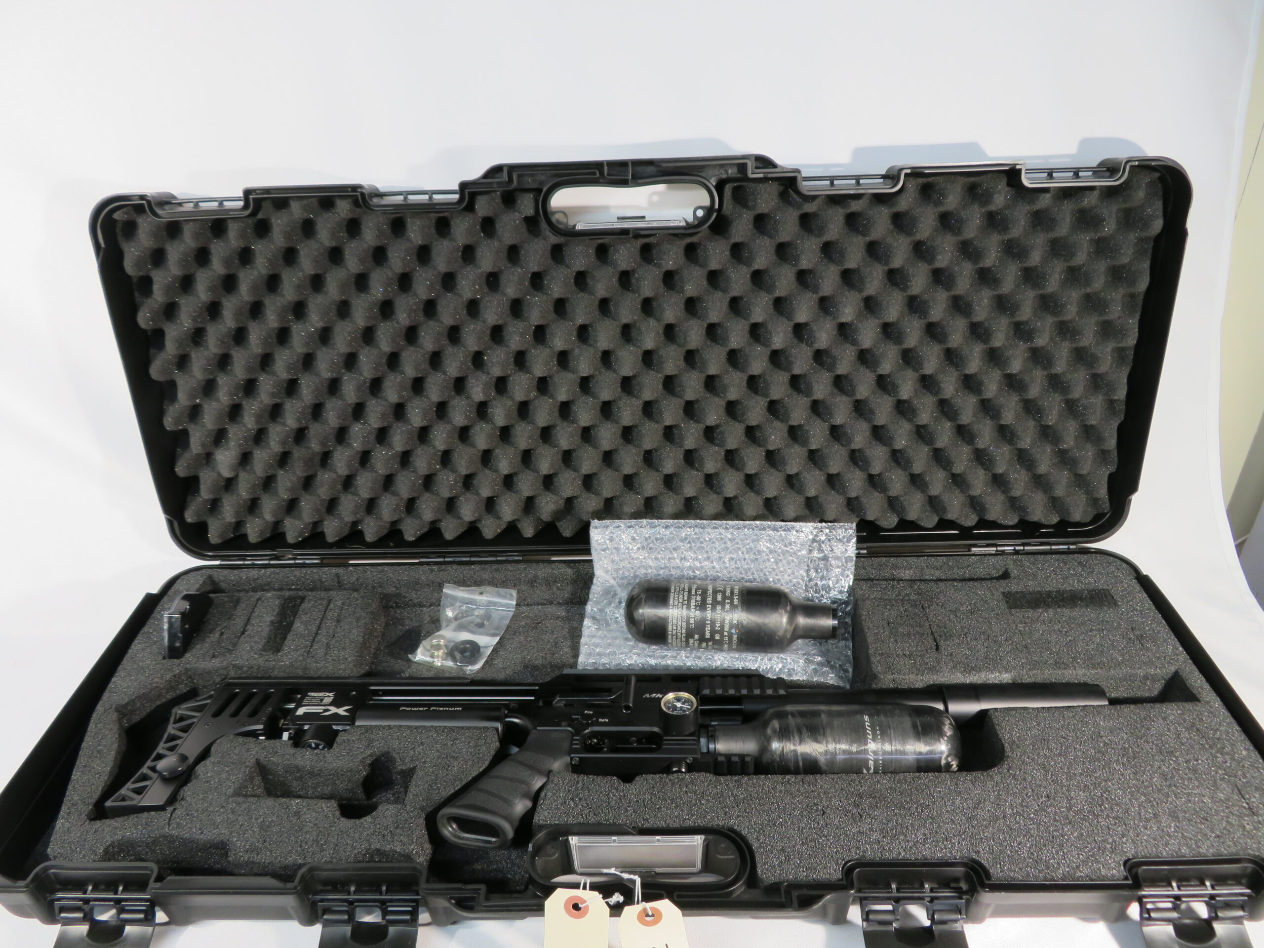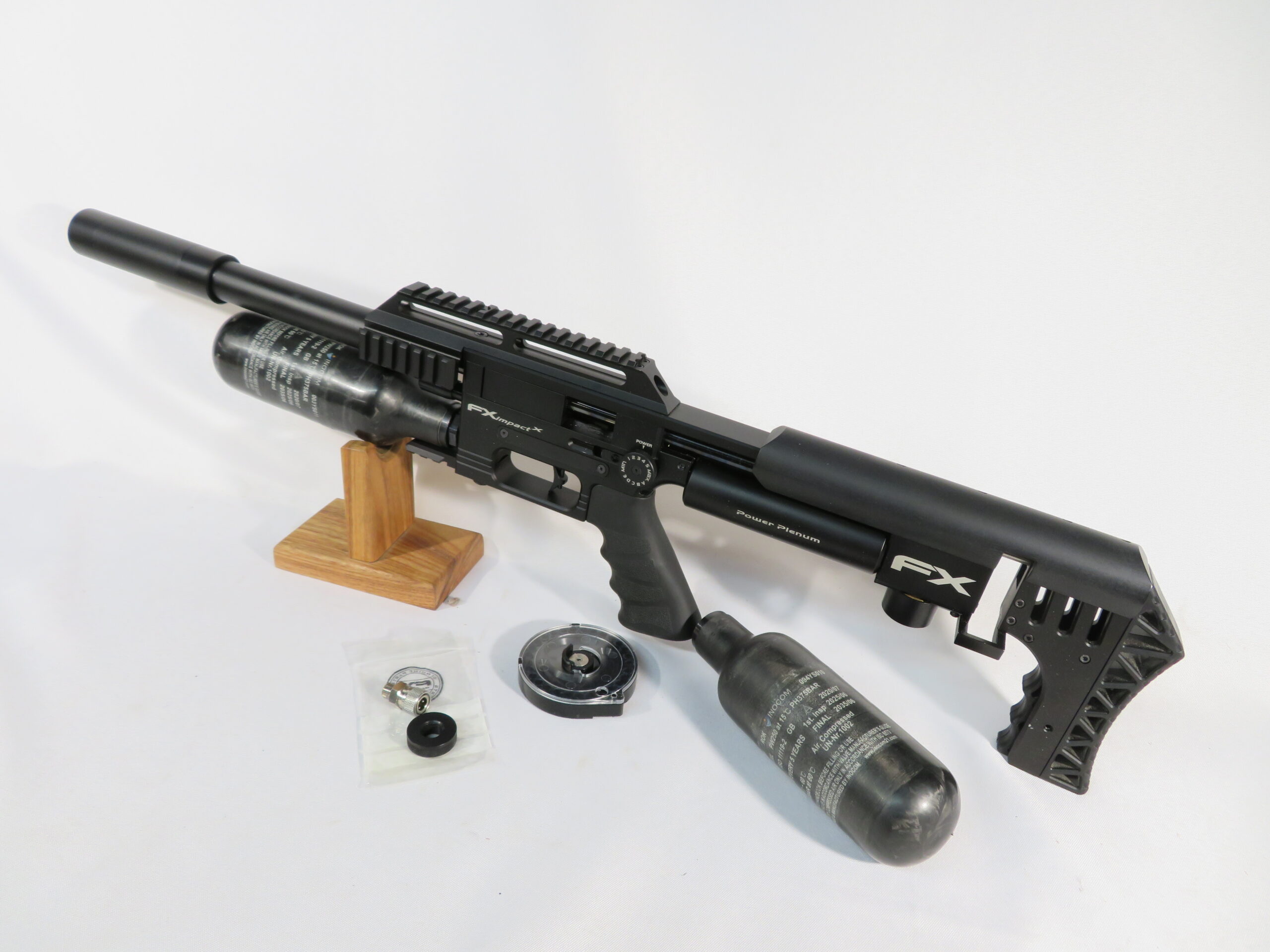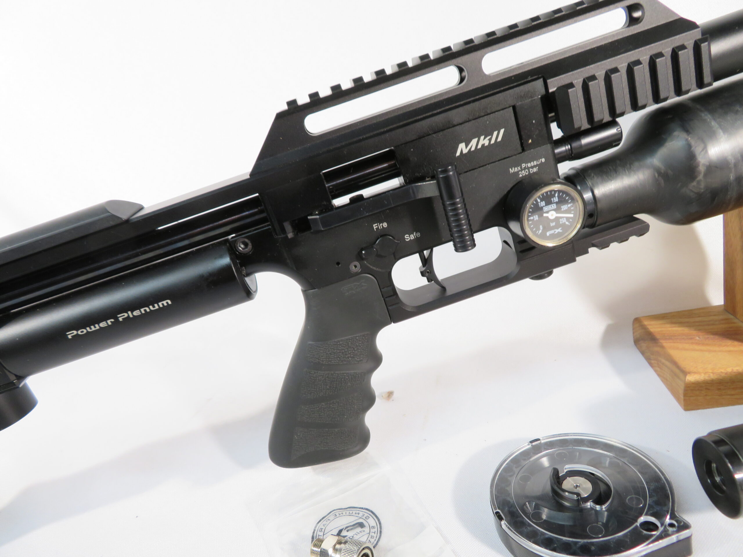 Here we have a recent trade in… a gently used MK2 Impact Compact, Black, in .25. Tested in our shop and in good working condition. This gun is shooting 33.95gr pellets at 850 fps