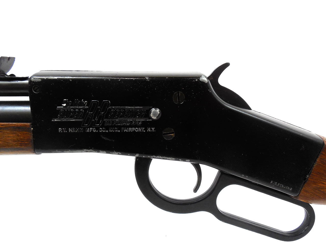 This is a BB caliber CO2 lever action repeater with a spring fed 30 shot magazine. This model also happens to be the first product of P.Y. Hahn Mfg. Co. of Fairpoint New York, and was manufactured between 1958 and 1971.
