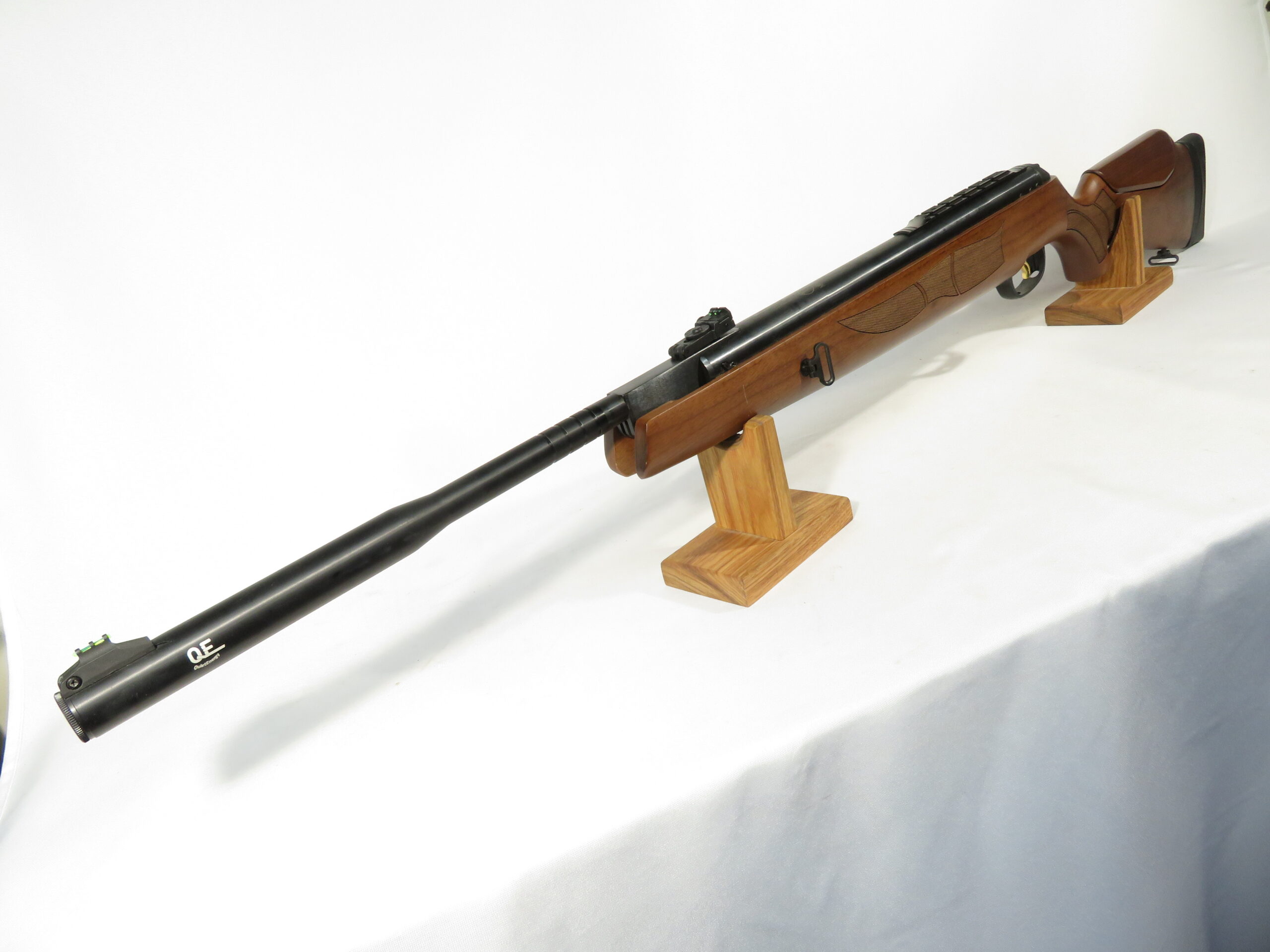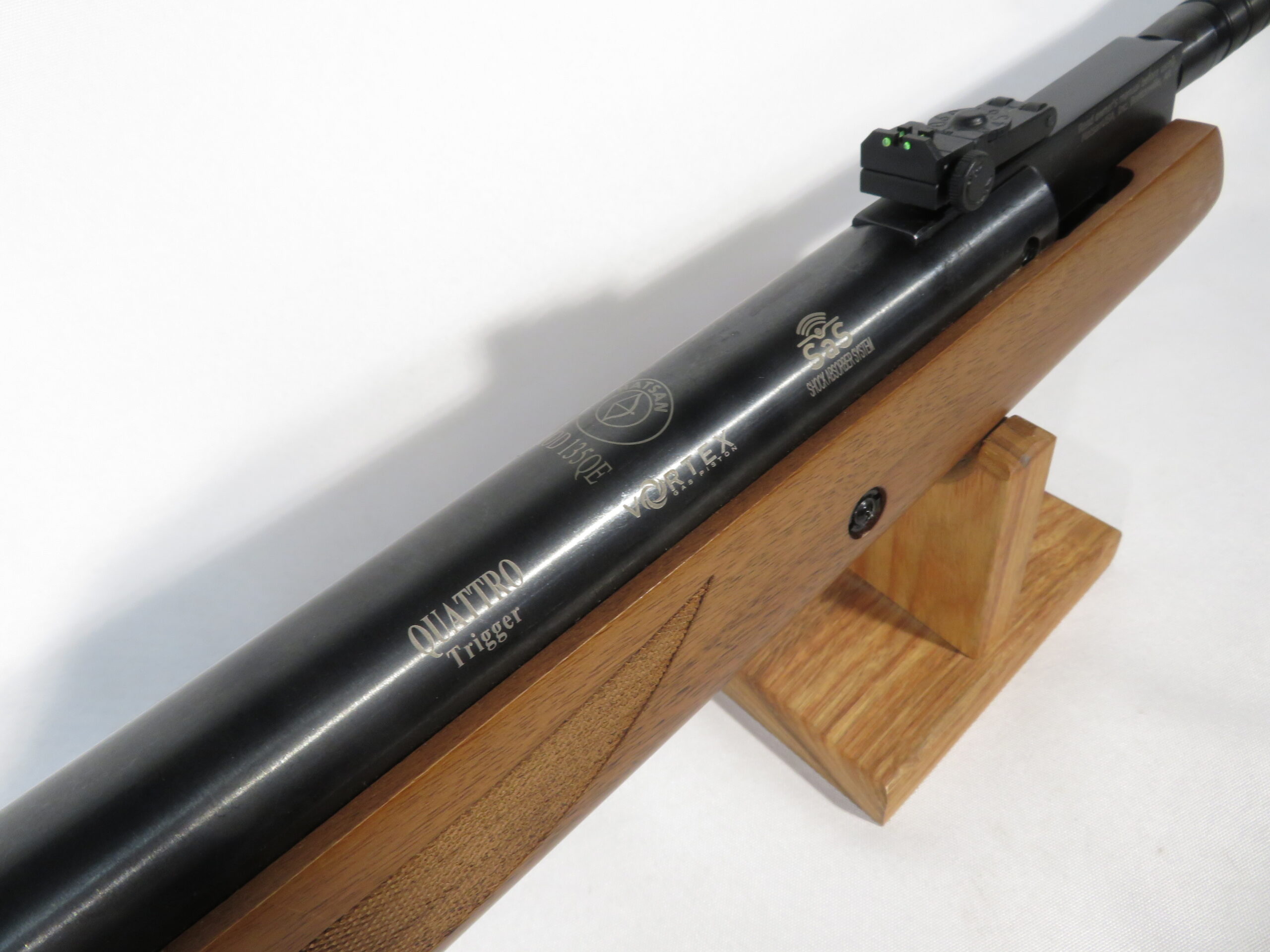 The Hatsan 135 QE Pellet Rifle is a gas piston break barrel with wood stock. Optics include weaver / 11mm dovetail scope rails, adjustable rear sights and fiber optic front sights.