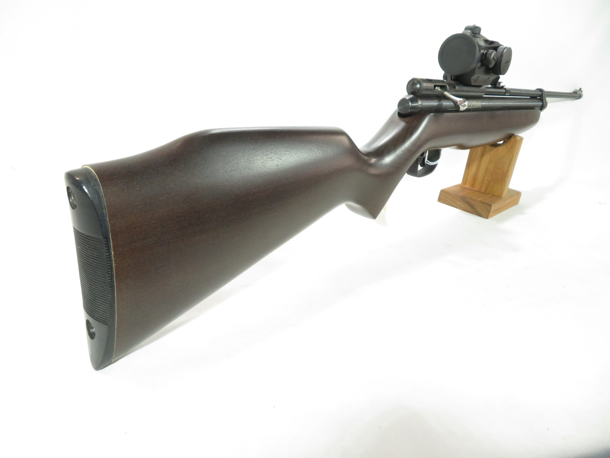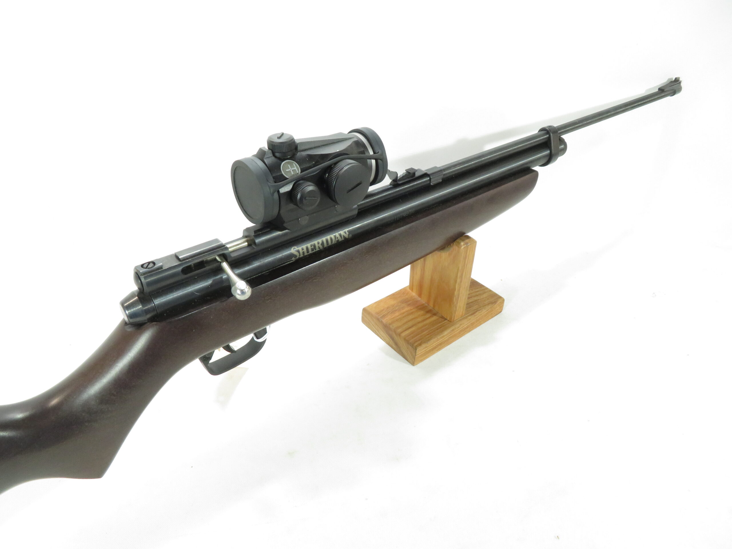 The Sheridan 2260 MB is a .22 caliber, bolt action CO2 pellet rifle with ambidextrous hardwood stock. This gun comes with a metal breech already on the gun. The breech has 11mm dovetail scope rails ( standard dovertail)Â so you’re all ready to mount a scope.